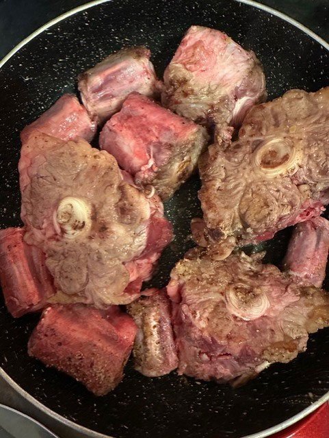 • Heat a large heavy pan and add your oxtail pieces to it. (no oil needed if oxtail has enough fat)
